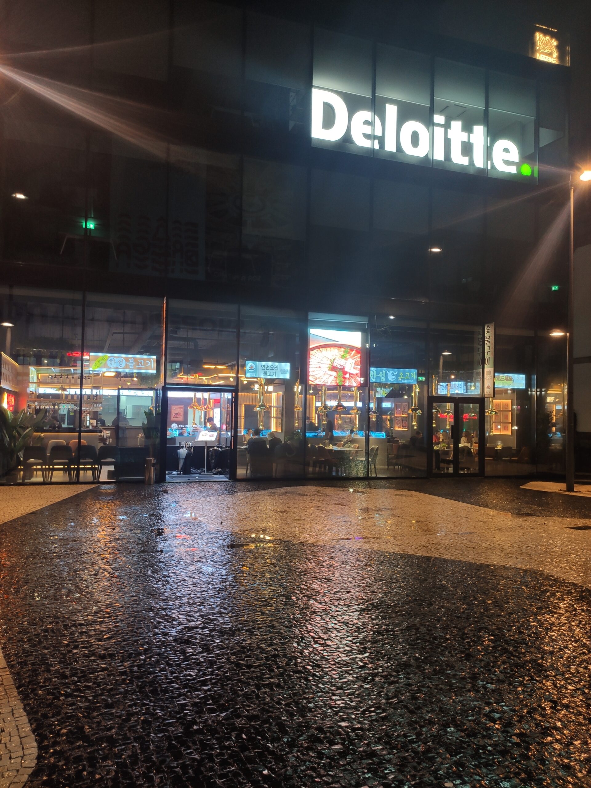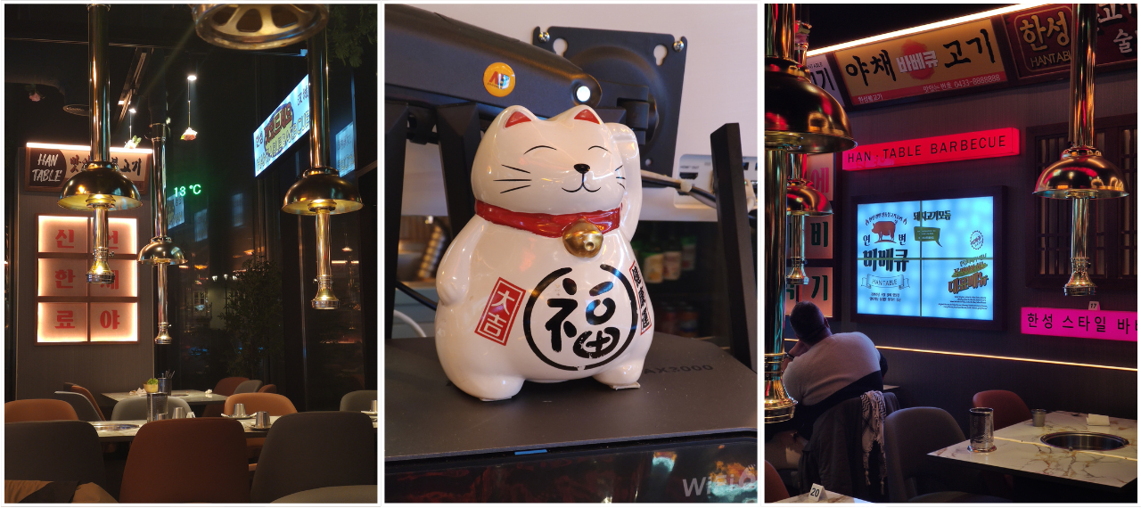 O Han Table Barbecue aposta numa estética contemporânea com influências urbanas coreanas. No interior, a decoração mistura industrial com moderno: luzes néon, painéis gráficos e signage em hangul reforçam a identidade coreana sem exageros. A iluminação, com tons quentes e néons coloridos, cria uma atmosfera vibrante e ligeiramente imersiva, perfeita para grupos e momentos de partilha.
